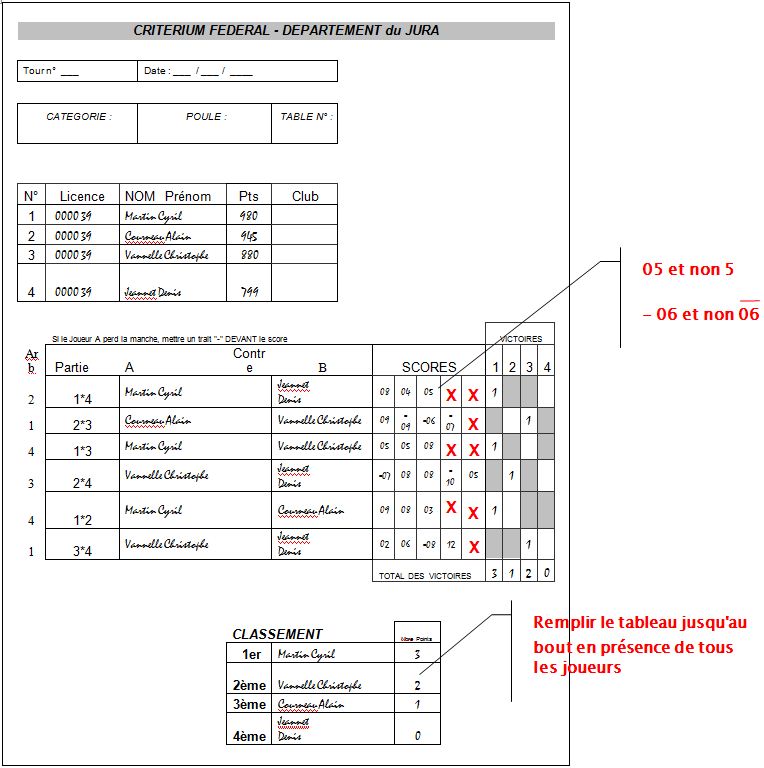 - de noter les scores lisiblement et entourer le vainqueur et les manches gagnées.
